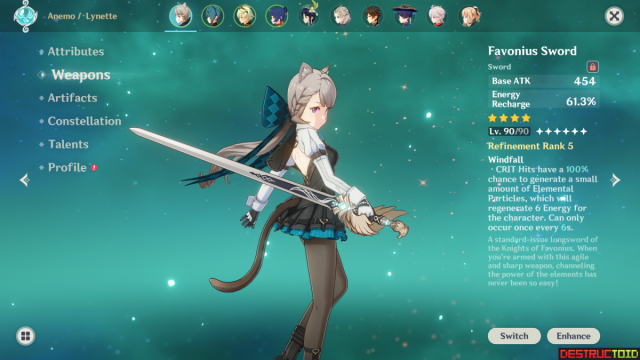 Favonius Sword – Provides Energy for Lynette and her team. There is some RNG attached to whether or not she activates the passive, but she should have three instances of damage while on-field in normal play, which means three chances at activation.
